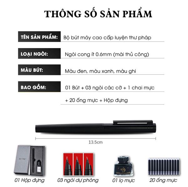 Bộ sản phẩm gồm: 1 bút máy ngòi 0.6mm cong vừa + 3 ngòi dự phòng các cỡ + 1 chai mực đen + 20 ống mực + hộp đựng sang trọng + Thẻ chính hãng.