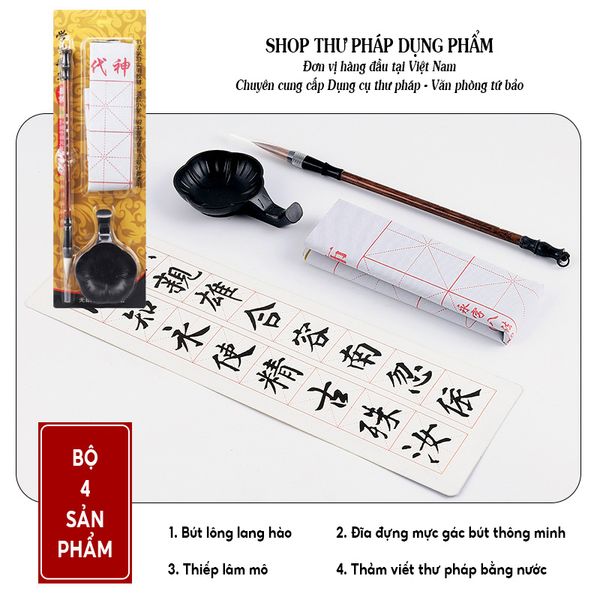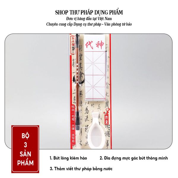 Giới thiệu: Bộ dụng cụ gồm những vật dụng thiết yếu cho người mới học thư pháp. Có nhiều bộ khác nhau để thư hữu lựa chọn phù hợp với nhu cầu sử dụng. Ngoài bộ 3 sản phẩm, các bộ còn lại đều có vải viết nước luyện viết thư pháp. Đây là loại vải khi dùng nước để viết sẽ hiện ra chữ màu đen, để sau 3-5 phút (tùy điều kiện thời tiết) nước sẽ bay hơi để bạn tiếp tục luyện tập. Nói chung, bộ sản phẩm này hướng để sự tiện dụng với các vật dụng tương đối cơ bản.