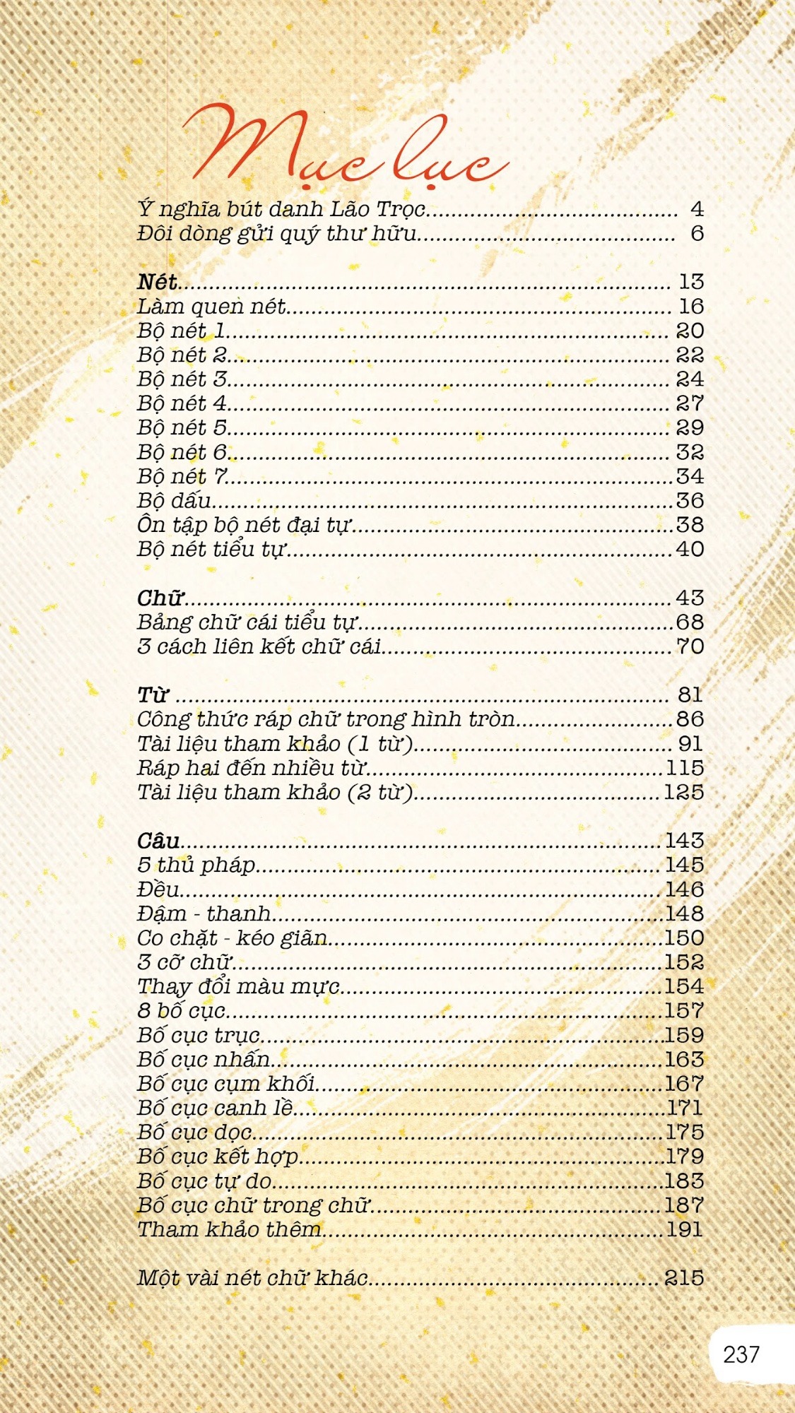 Cuốn sách gồm 238 trang. Là toàn bộ những kính nghiệm và đúc kết của Trọc về Thư pháp mà mọi người đã thấy Trọc chia sẻ trong thời gian qua, tất nhiên qua mỗi đoạn thời gian thì sự nhìn nhận của Trọc cũng thay đổi nhiều, phần lớn là để cuốn sách được chỉn chu nhất có thể.